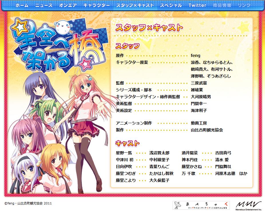 별하늘에 놓이는 다리는 2008년에 미연시 게임을 애니화 했던 노을빛으로 물드는 언덕이라는 작품의 후속작이라고 불리기도 하는데, 초호화 성우진이었던 노을빛과는 달리 한국에는 그렇게 많이 알려지지 않은 성우분들이 많이 보이는군요;ㅁ;