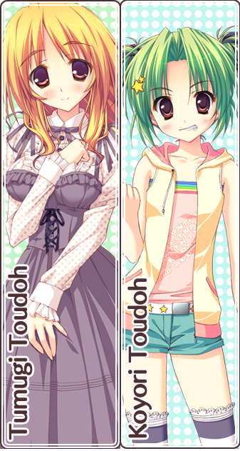 사진 왼쪽의 금발 캐릭터가 토우도 츠무기입니다. 왼쪽이 언니이고 오른쪽이 동생입니다.