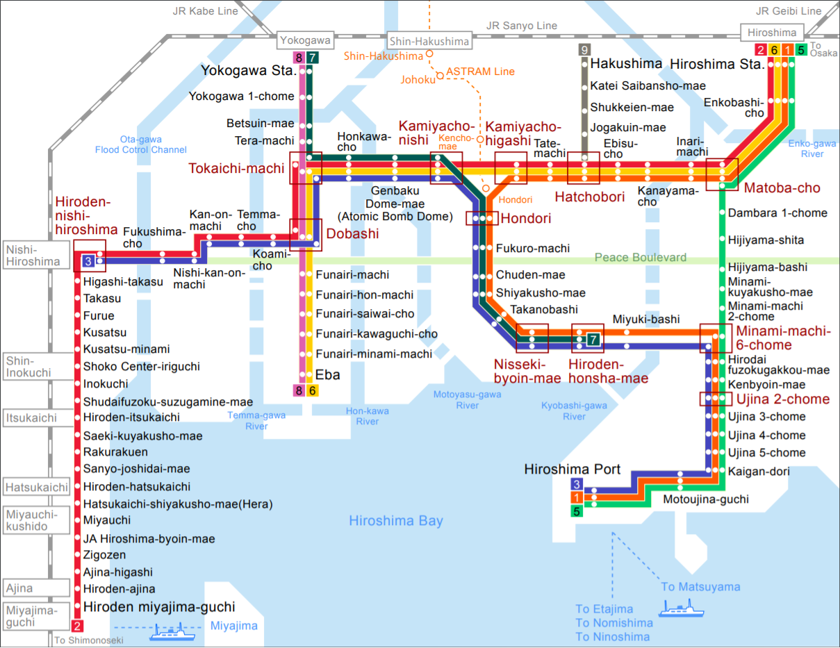 왼쪽 2번 빨간색 라인 종점인 Hiroden-miyajima-guchi(広電宮島口, 히로덴 미야지마구치)에 내리면 된다.
