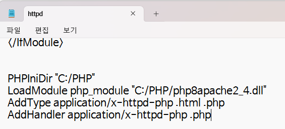 아파치의 httpd.conf 파일에서 PHP와 아파치를 연결시켜 주었습니다.