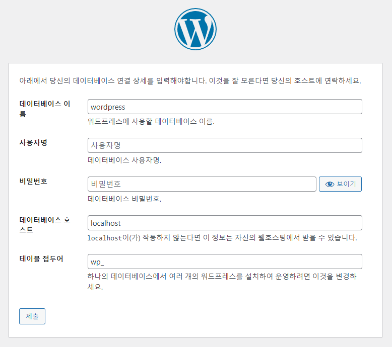 워드프레스의 데이터가 들어갈 '데이터베이스 테이블'을 생성해 줍니다.