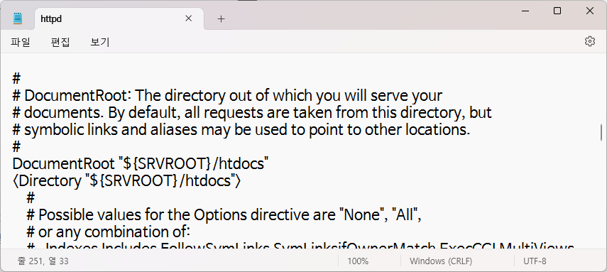 아파치 설치 후 conf 폴더에서 httpd.conf 파일을 메모장으로 열어주고